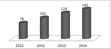 Öte yandan TÜRKAK tarafından bu alanda akredite edilen laboratuvar sayısı her yıl artmaktadır. 2011-2014 yılları arasında akredite edilen gıda analiz laboratuvarlarının sayıları Şekil 2 de verilmiştir. Bu sayılar merkez laboratuvarlara ait olup şubeler hesaplamaya katılmamıştır.